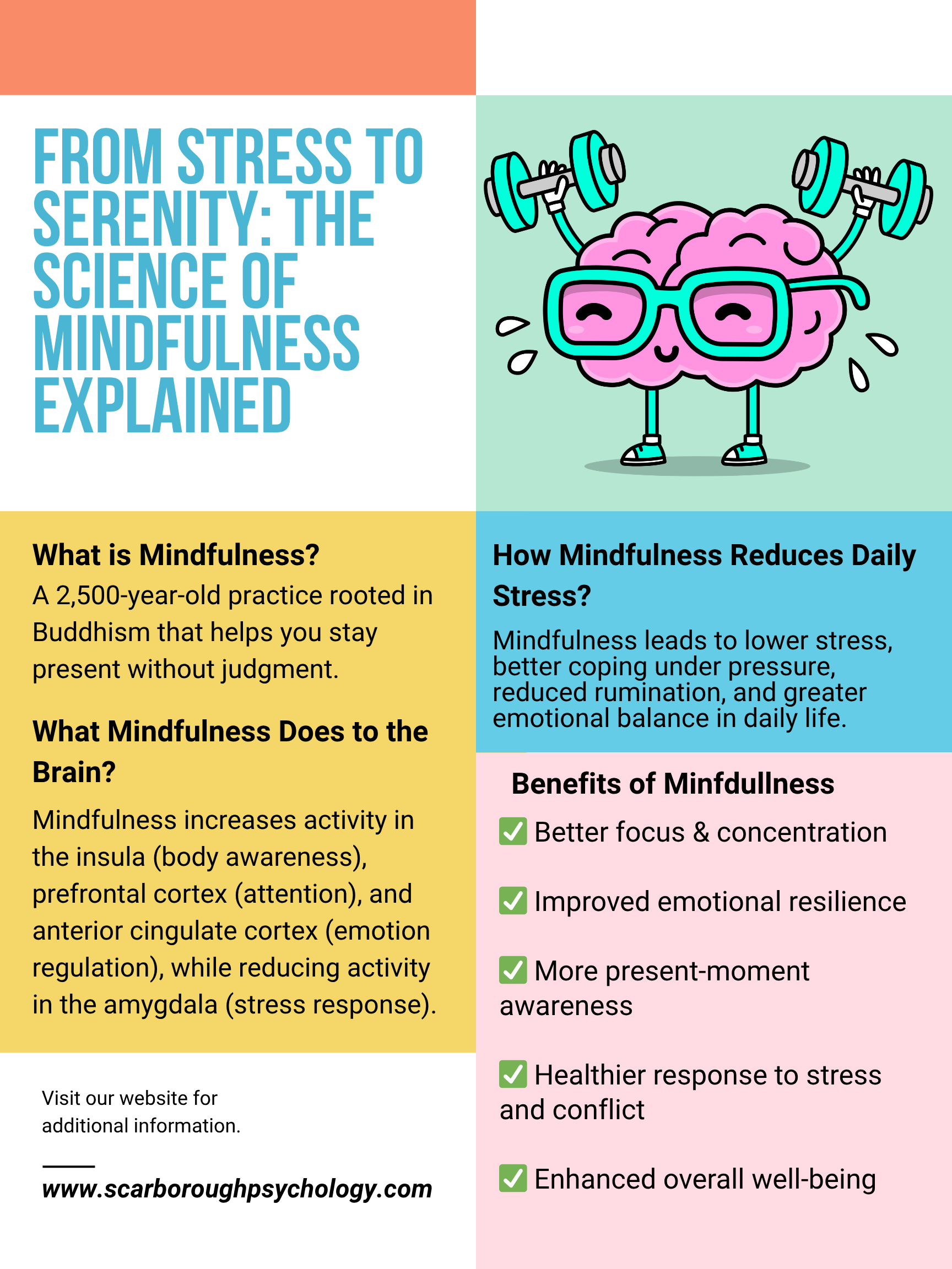 A colorful infographic titled “From Stress to Serenity: The Science of Mindfulness Explained.” It explains what mindfulness is, how it impacts the brain and reduces stress, and lists benefits like improved focus, emotional resilience, and overall well-being. It includes a cartoon brain lifting dumbbells and Scarborough Psychology Clinic’s website link.